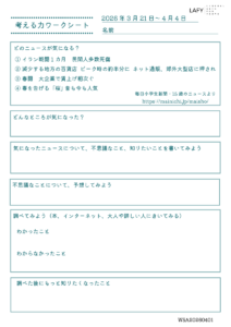 今週のニュースから思考を広げる「考える力ワークシート」を更新しました。ご自宅でのお子さまの学習に、ご家庭での会話の素材に、ぜひご活用ください。 考える力ワークシート(10代向け) かんがえるこどもワーク(10歳程度のお子 […]