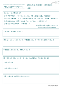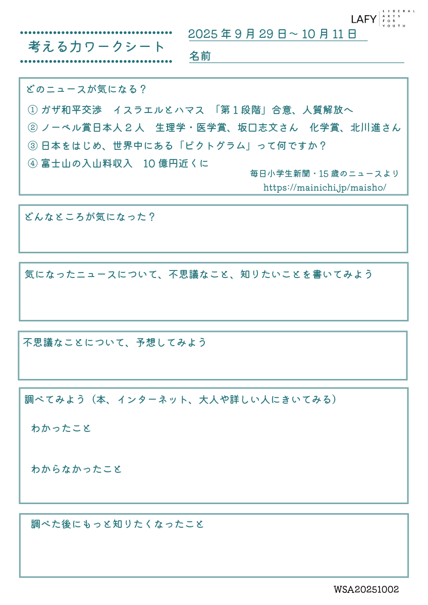 考える力ワークシート 更新 2025/10/16 2025年10月11日 最終更新日時 : 2025年10月11日 LAFY 今週のニュースから思考を広げる「考える力ワークシート」を更新しました。ご自宅でのお子さまの学習に、ご家庭での会話の素材に、ぜひご活用ください。 考える力ワークシート(10代向け) 10_16_worksheet-1ダウンロード かんがえるこどもワーク(10歳程度のお子さま向け) 10_16_worksheet-2ダウンロード FacebookXBlueskyHatenaCopy