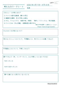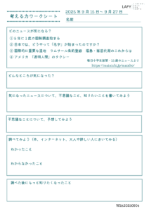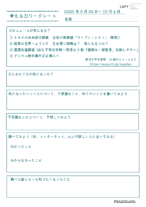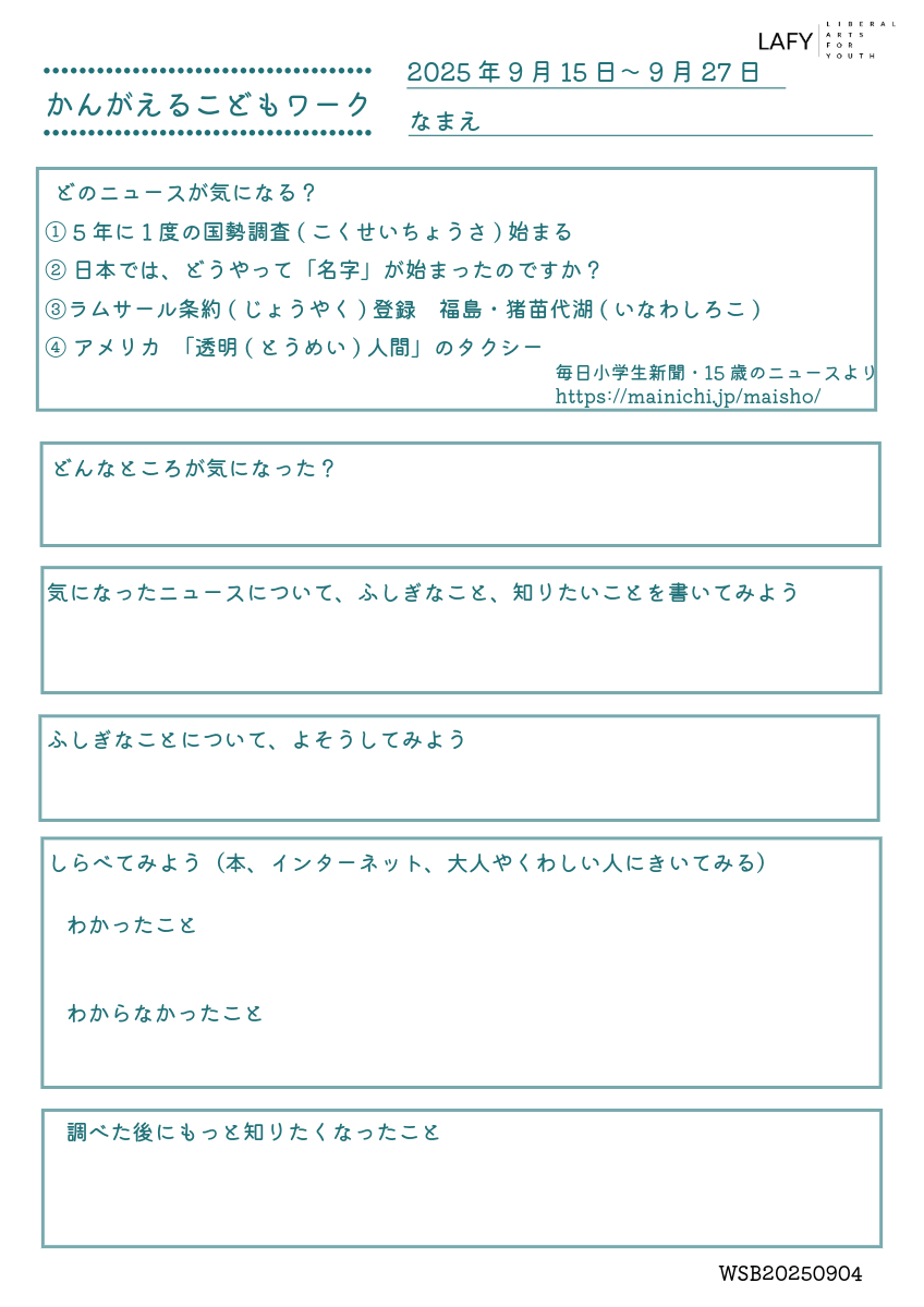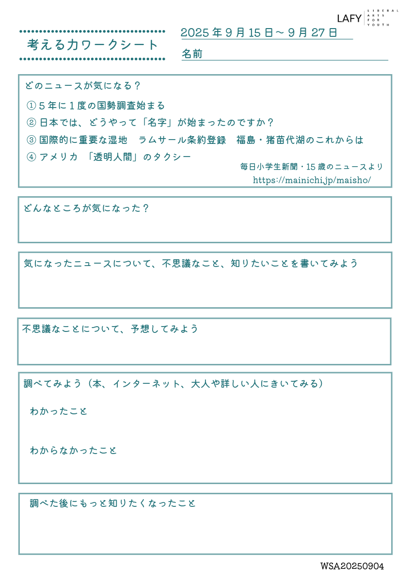 考える力ワークシート 更新 2025/10/2 2025年9月28日 最終更新日時 : 2025年9月28日 LAFY 今週のニュースから思考を広げる「考える力ワークシート」を更新しました。ご自宅でのお子さまの学習に、ご家庭での会話の素材に、ぜひご活用ください。 考える力ワークシート(10代向け) 10_02_worksheet-1ダウンロード かんがえるこどもワーク(10歳程度のお子さま向け) 10_02_worksheet-2ダウンロード FacebookXBlueskyHatenaCopy