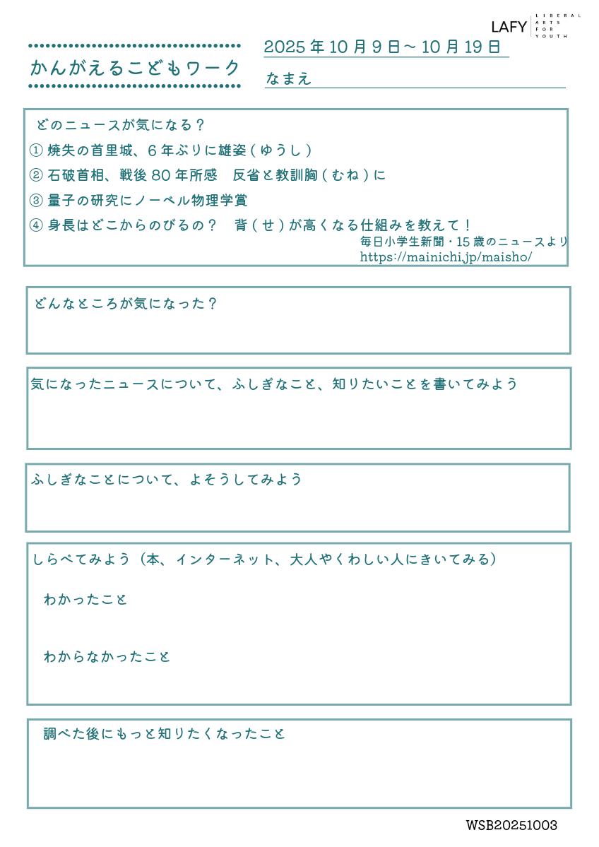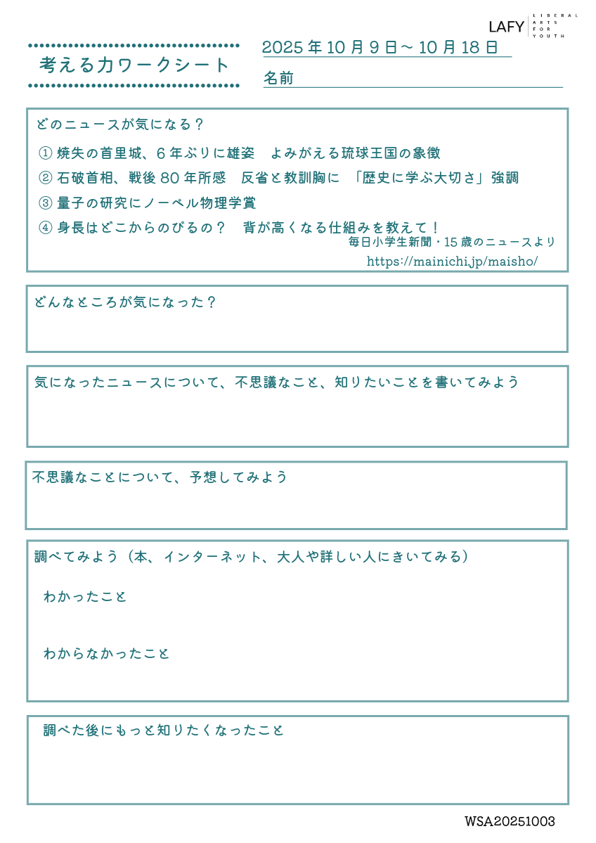 今週のニュースから思考を広げる「考える力ワークシート」を更新しました。