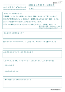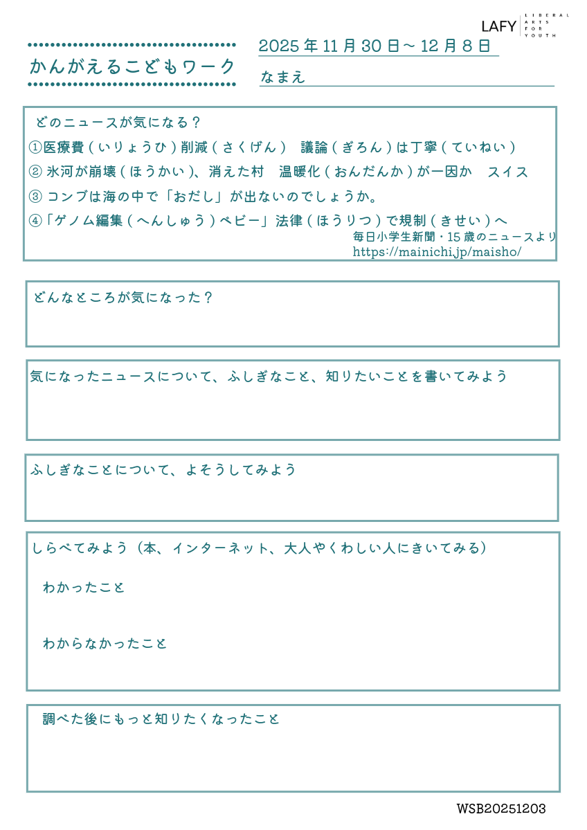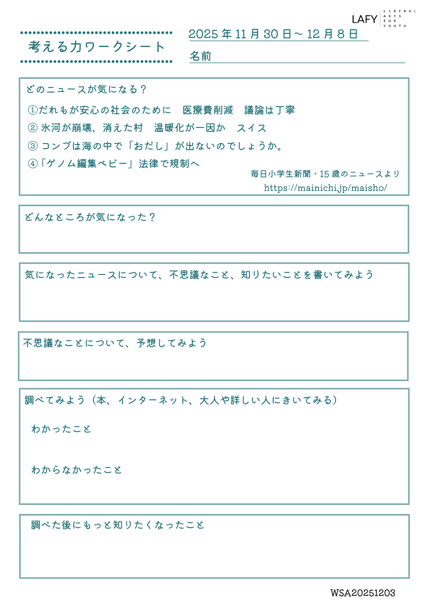 考える力ワークシート 更新 2025/12/18 2025年12月17日 最終更新日時 : 2025年12月17日 LAFY 今週のニュースから思考を広げる「考える力ワークシート」を更新しました。ご自宅でのお子さまの学習に、ご家庭での会話の素材に、ぜひご活用ください。 考える力ワークシート(10代向け) 12_18_worksheet-1ダウンロード かんがえるこどもワーク(10歳程度のお子さま向け) 12_18_worksheet-2ダウンロード FacebookXBlueskyHatenaCopy
