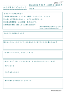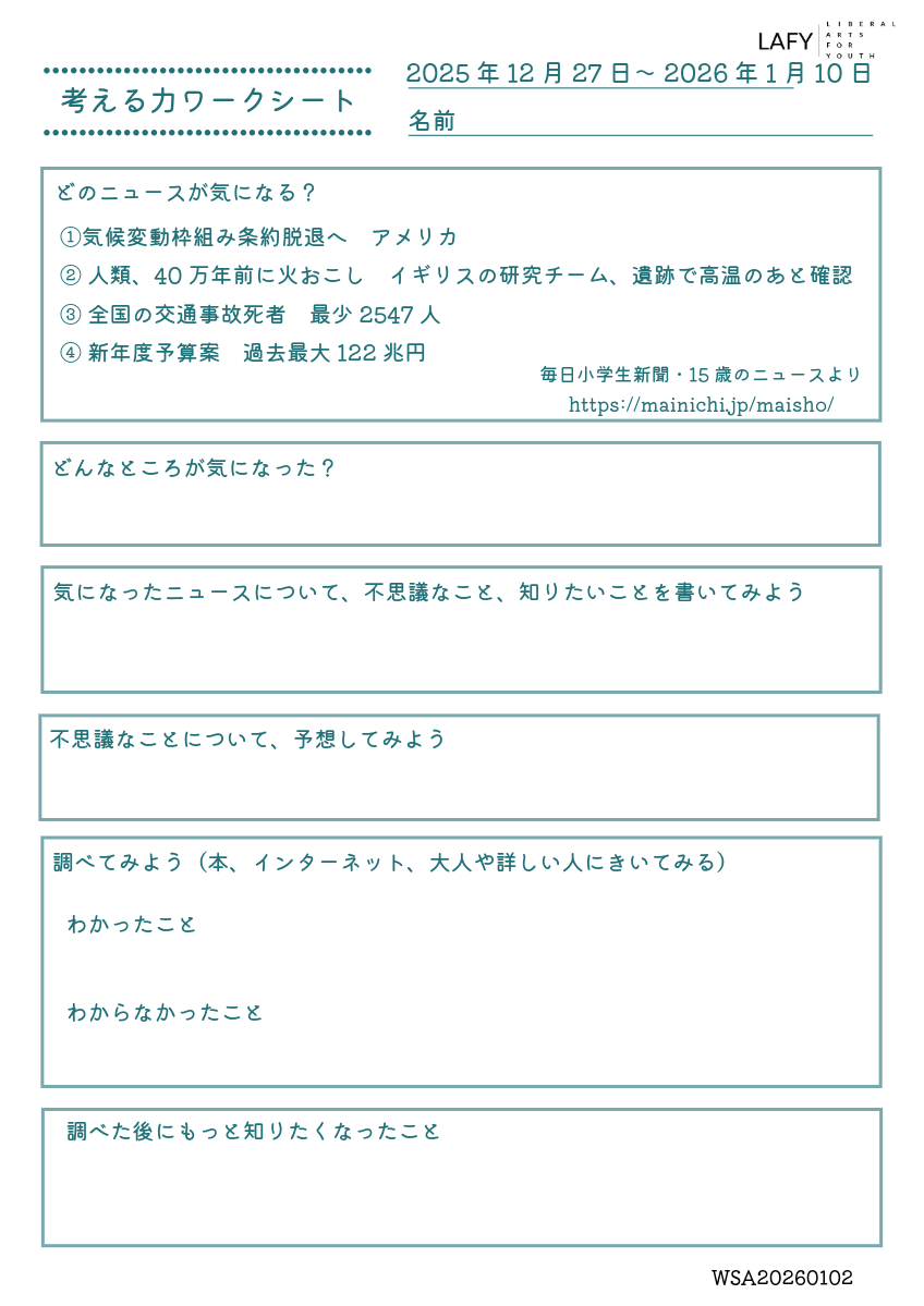 考える力ワークシート 更新 2026/1/15 2026年1月11日 最終更新日時 : 2026年1月11日 LAFY 今週のニュースから思考を広げる「考える力ワークシート」を更新しました。ご自宅でのお子さまの学習に、ご家庭での会話の素材に、ぜひご活用ください。 考える力ワークシート(10代向け) 01_15_worksheet-1ダウンロード かんがえるこどもワーク(10歳程度のお子さま向け) 01_15_worksheet-2ダウンロード FacebookXBlueskyHatenaCopy
