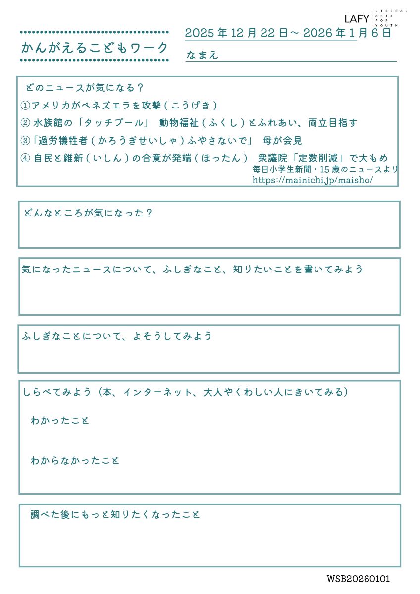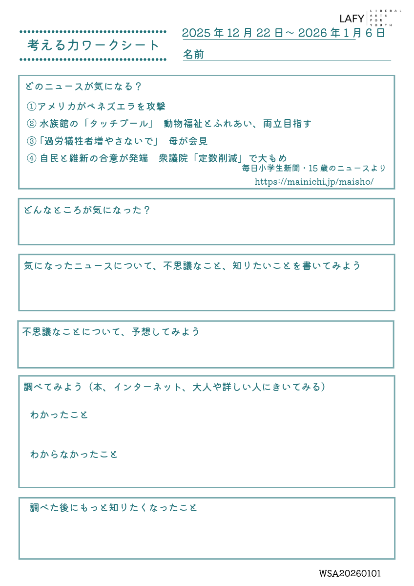 考える力ワークシート 更新 2026/1/8 2026年1月6日 最終更新日時 : 2026年1月6日 LAFY 今週のニュースから思考を広げる「考える力ワークシート」を更新しました。ご自宅でのお子さまの学習に、ご家庭での会話の素材に、ぜひご活用ください。 考える力ワークシート(10代向け) 01_08_worksheet-1ダウンロード かんがえるこどもワーク(10歳程度のお子さま向け) 01_08_worksheet-2ダウンロード FacebookXBlueskyHatenaCopy