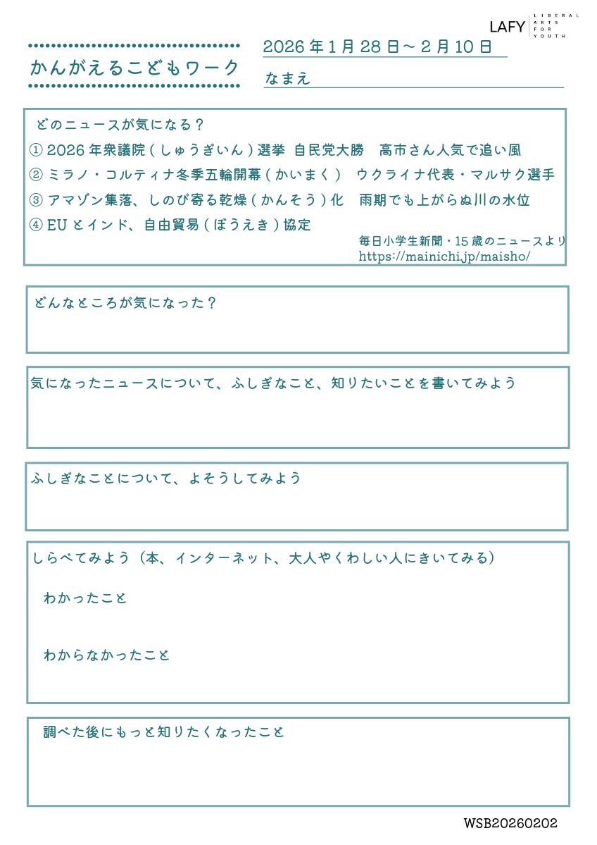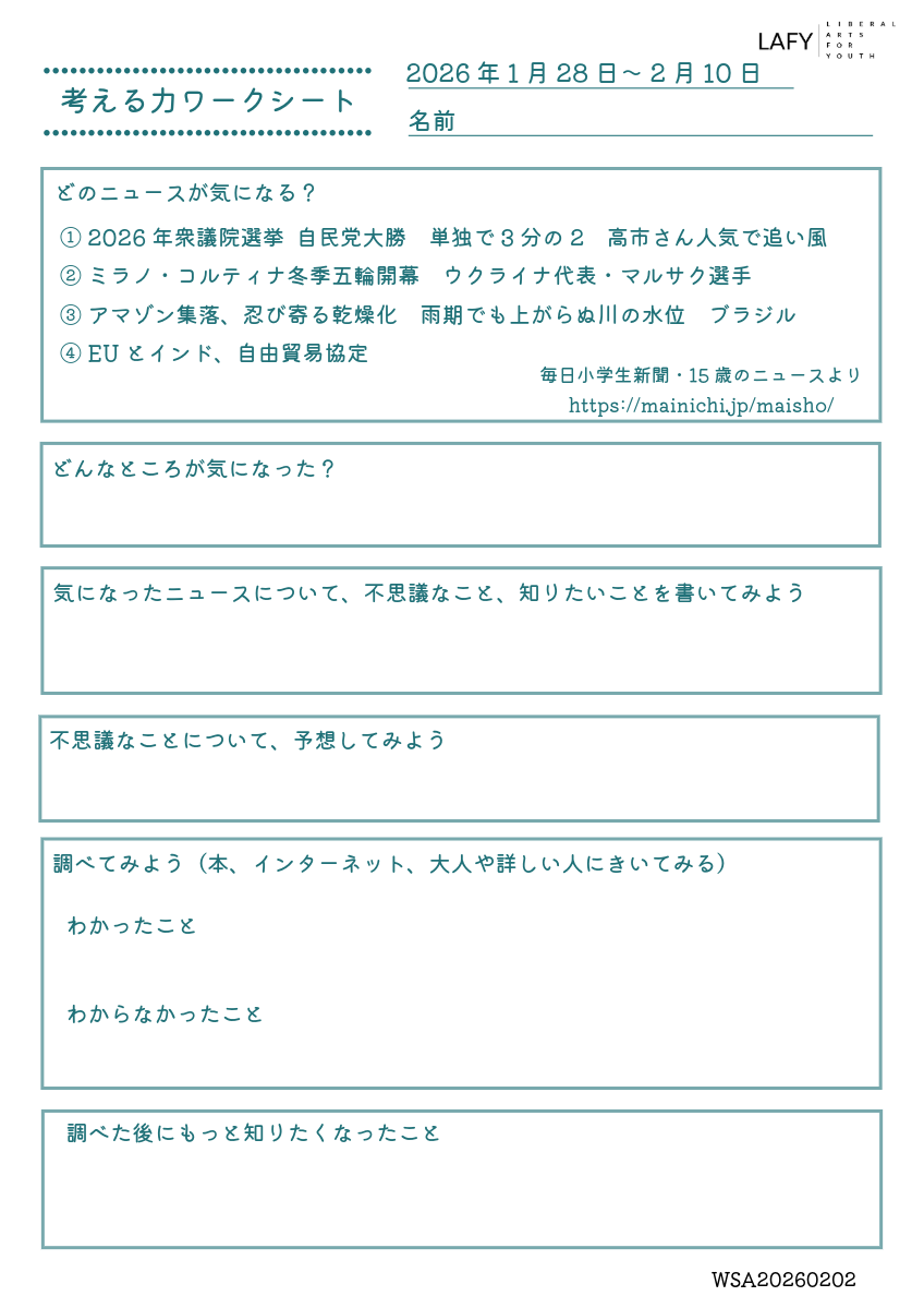 今週のニュースから思考を広げる「考える力ワークシート」を更新しました。