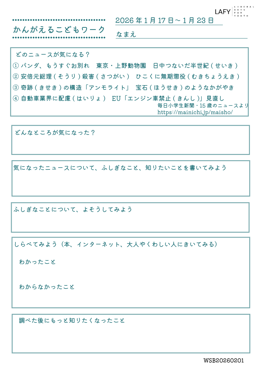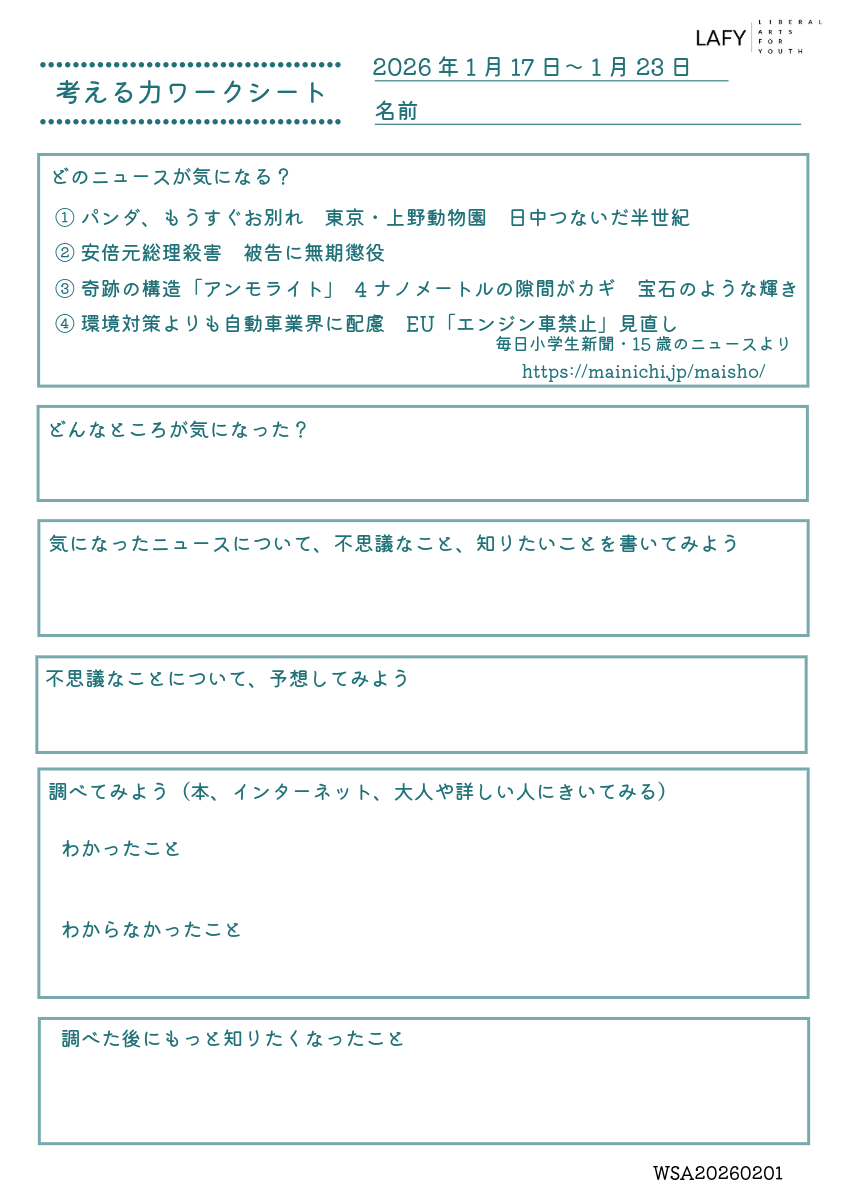 考える力ワークシート 更新 2026/2/5 2026年2月1日 最終更新日時 : 2026年2月1日 LAFY 今週のニュースから思考を広げる「考える力ワークシート」を更新しました。ご自宅でのお子さまの学習に、ご家庭での会話の素材に、ぜひご活用ください。 考える力ワークシート(10代向け) 02_05_worksheet-1ダウンロード かんがえるこどもワーク(10歳程度のお子さま向け) 02_05_worksheet-2ダウンロード FacebookXBlueskyHatenaCopy