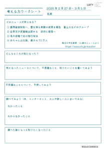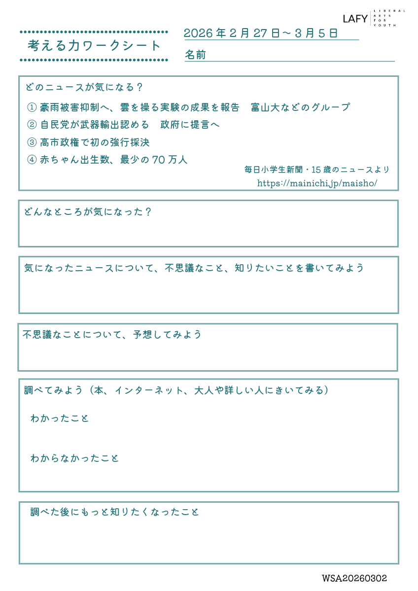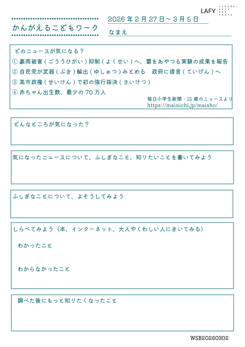 考える力ワークシート 更新 2026/3/12 2026年3月7日 最終更新日時 : 2026年3月7日 LAFY 今週のニュースから思考を広げる「考える力ワークシート」を更新しました。ご自宅でのお子さまの学習に、ご家庭での会話の素材に、ぜひご活用ください。 考える力ワークシート(10代向け) 03_12_worksheet-1ダウンロード かんがえるこどもワーク(10歳程度のお子さま向け) 03_12_worksheet-2ダウンロード FacebookXBlueskyHatenaCopy